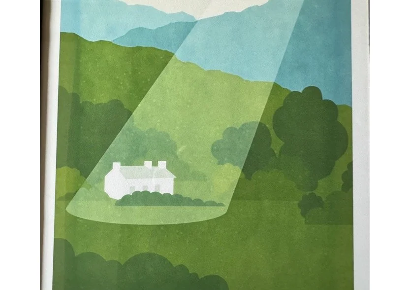 Anyway continuing with this creative bent, back in 2010, we had a back stairwell in the office, that we used for local artists to exhibit their paintings. On the third floor, there was this graphic depiction of a white farmhouse, nestled in the green hills, a spotlight shining down on it. It was there I saw our dream, just sitting there, the depiction of our future. I bought it but little did I know that that farmhouse would be bought one day, and it would be ours.